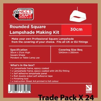 This pack contains 24 individually packaged 30cm Rounded Square Lampshade Making Kits ready for either online or in-store retail.